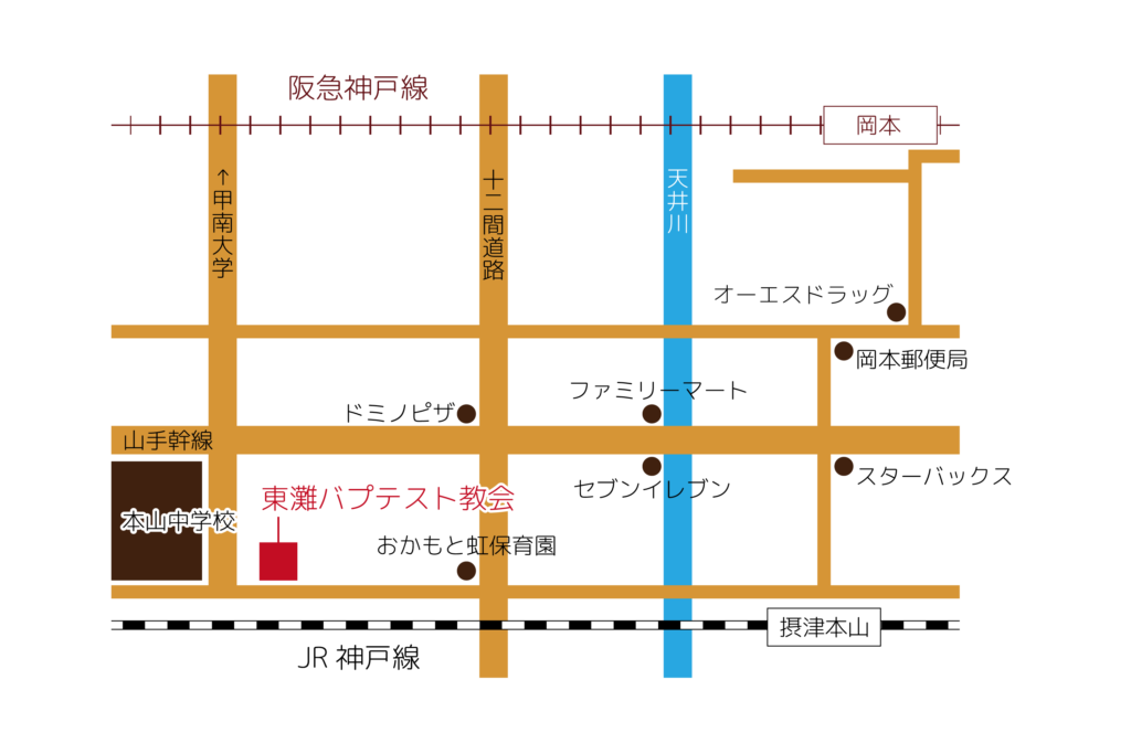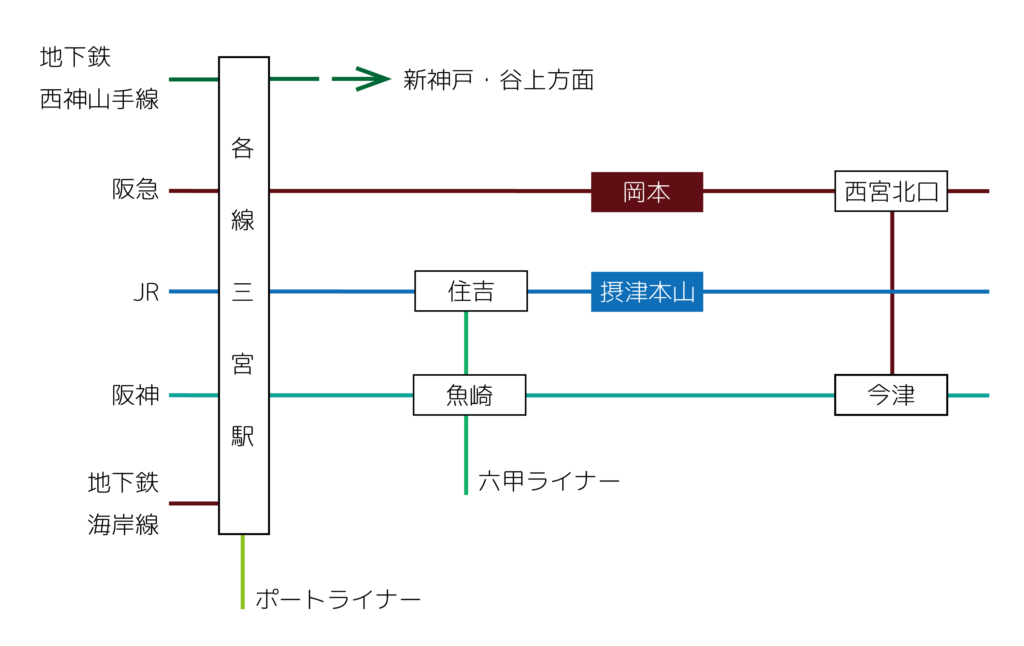 アクセスマップ JR神戸線「摂津本山駅」から徒歩10分阪急電鉄神戸線「岡本駅」から徒歩15分 交通案内 JRの最寄駅「摂津本山駅」には普通電車のみ停車します。ご注意ください。阪急電鉄でお越しの際、最寄駅の「岡本駅」にはすべての種類の電車が停車します。
